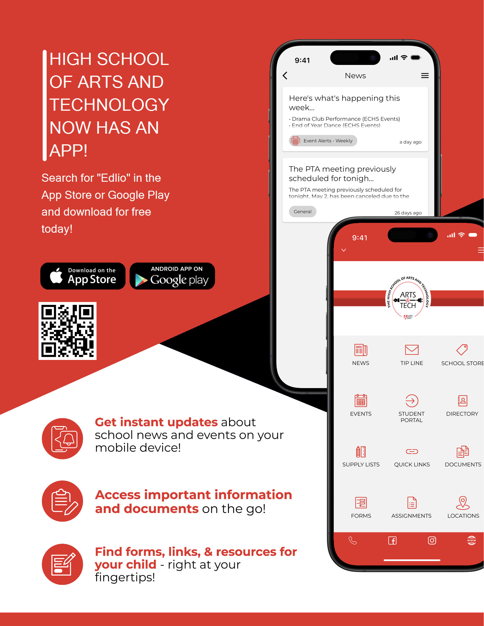 The High School of Arts and Technology app is free and provides parents, students, and staff with immediate access to everything school-related, including calendars, directions to events, contact information for teachers and administrators, important documents, bell schedules, and more. Seniors can even pay their dues through the convenient online system!